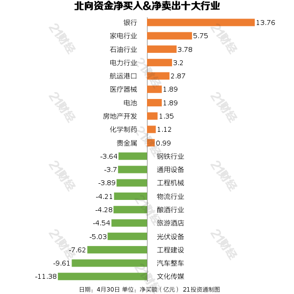 从净买入金额来看,北向资金增持了20个行业,其中银行居首,净买入金额达13.76亿元,其次是家电行业,净买入5.75亿元。