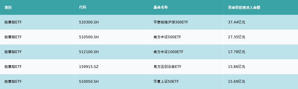 上周股票型ETF资金流入最多的5支ETF及其流入金额分别为:华泰柏瑞沪深300ETF(流入37.44亿元)、南方中证500ETF(流入27.35亿元)、南方中证1000ETF(流入17.78亿元)、易方达创业板ETF(流入15.86亿元)、华夏上证50ETF(流入15.69亿元)。详情见下表: