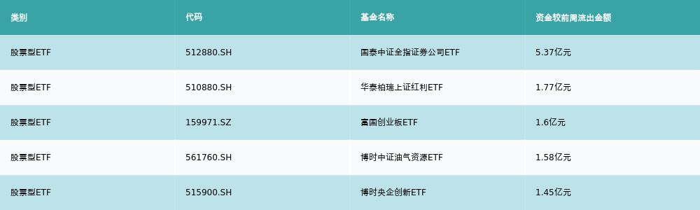 上周股票型ETF资金流出最多的5支ETF及其流入金额分别为:国泰中证全指证券公司ETF(流出5.37亿元)、华泰柏瑞上证红利ETF(流出1.77亿元)、富国创业板ETF(流出1.6亿元)、博时中证油气资源ETF(流出1.58亿元)、博时央企创新ETF(流出1.45亿元)。详情见下表: