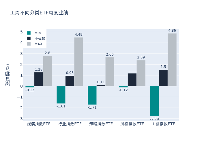 上周股票型ETF周度收益率中位数为1.29%。其中按照不同分类,规模指数中南方上证科创板100ETF周度收益率最高,为2.8%;行业指数中博时龙头家电ETF周度收益率最高,为4.49%;策略指数中华夏创业板低波价值ETF周度收益率最高,为2.66%;风格指数中嘉实医药健康100ETF周度收益率最高,为2.39%;主题指数中南方上证科创板新材料ETF周度收益率最高,为4.86%。