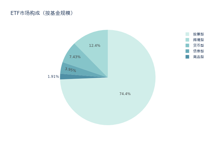 基金规模方面,上周ETF市场总规模达到24824.47亿元,较前一周增加237.85亿元。其中,股票型ETF为18459.22亿元,债券型ETF为979.98亿元,货币型ETF为1843.53亿元,商品型ETF为475.21亿元,跨境型ETF为3066.53亿元。