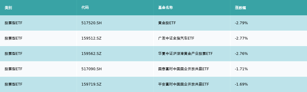 上周股票型ETF跌幅最大的5支ETF及其收益率分别为:黄金股ETF(-2.79%)、广发中证全指汽车ETF(-2.77%)、华夏中证沪深港黄金产业股票ETF(-2.76%)、国泰富时中国国企开放共赢ETF(-1.71%)、平安富时中国国企开放共赢ETF(-1.69%)。详情见下表: