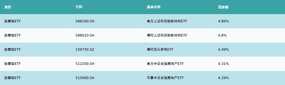上周股票型ETF涨幅最高的5支ETF及其收益率分别为:南方上证科创板新材料ETF(4.86%)、博时上证科创板新材料ETF(4.8%)、博时龙头家电ETF(4.49%)、南方中证全指房地产ETF(4.31%)、华夏中证全指房地产ETF(4.29%)。详情见下表: