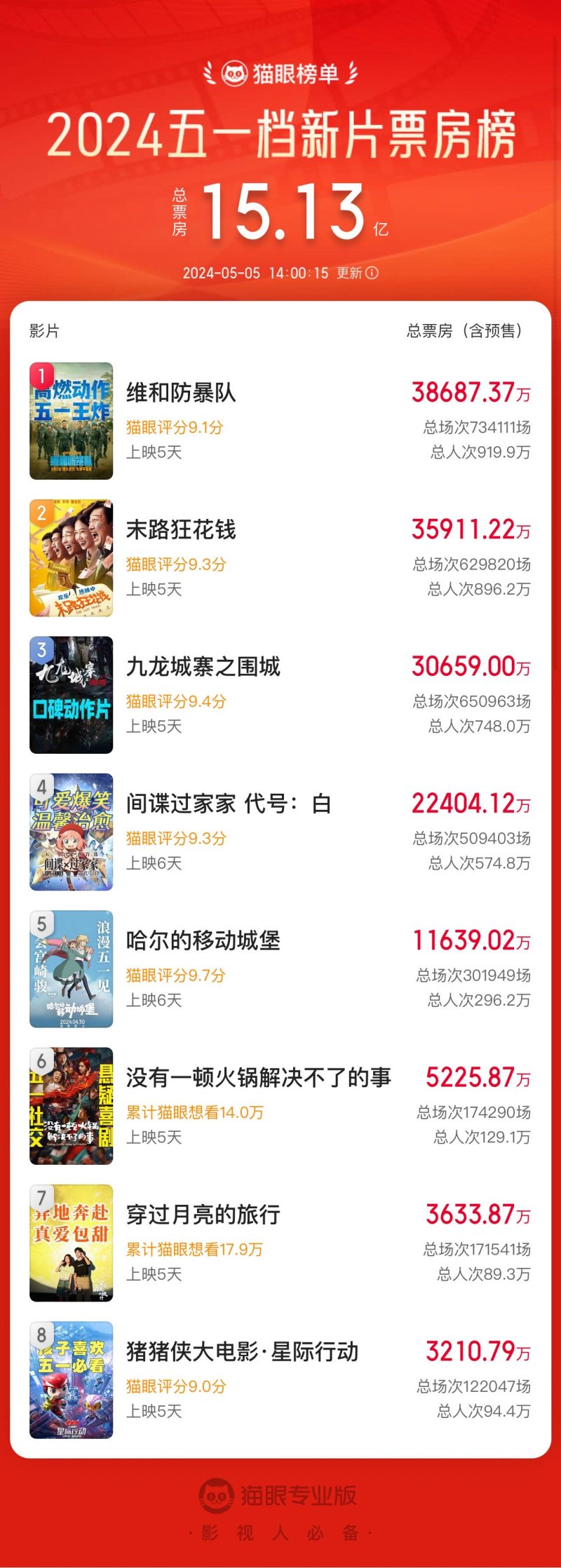猫眼专业版显示,截至5月5日14时,2024年五一档新片总票房(含预售)超15亿元。其中,《维和防暴队》《末路狂花钱》《九龙城寨之围城》分列票房榜前三位,杨幂主演的《没有一顿火锅解决不了的事》落入下风。