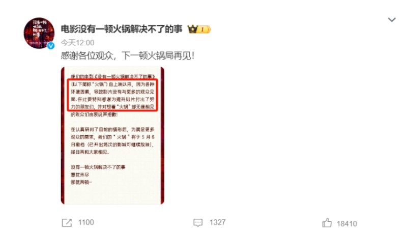 或受票房成绩影响,《没有一顿火锅解决不了的事》官宣将于5月6日正式撤档。