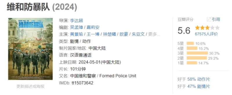 该片主要出品公司达6家,包括上市公司万达影业和捷成股份,联合出品公司达5家,包括上市公司欢瑞世纪。光大证券研报显示,《维和防暴队》有望成为2024年五一档票房冠军。虽然大概率是档期内票房冠军,但该片的预测票房仅为6亿多。一组可以对比的数据是,同样是由王一博主演的、在去年同期上映的主旋律电影《长空之王》的总票房累计有8.5亿。