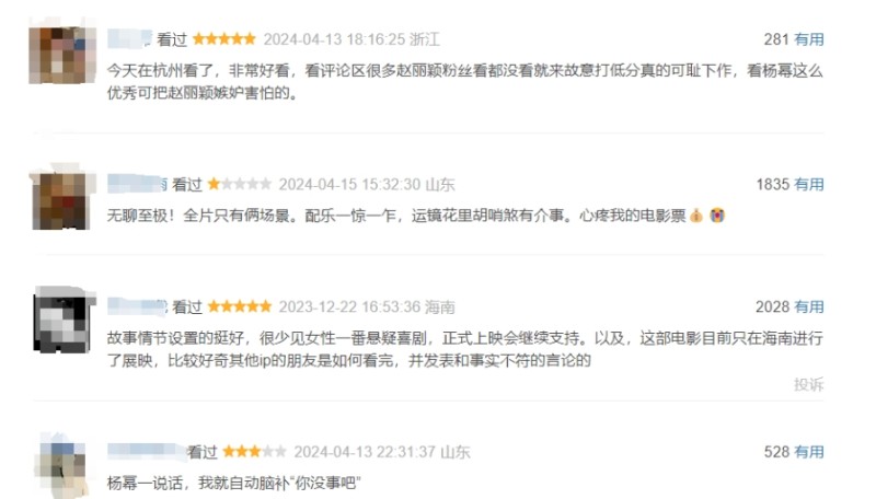 上映首日,该片日票房约为1821万元,第二日便下跌至945万元,几近腰斩。目前该片的豆瓣评分显示为6.3分,从观众反馈来看,尽管讨论焦点集中在主演杨幂身上,部分评论两极分化。但也有网友辣评称,“这部电影完全展现了导演和每一个演员的上限所在,可以叫《没有一部电影证明不了的事》。”