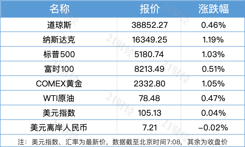 1、美股三大指数集体收涨,纳指涨1.19%,标普500指数涨1.03%,道指涨0.46%。大型科技股多数上涨,奈飞、英伟达、Meta涨超3%,特斯拉、微软、亚马逊涨超1%,英特尔、谷歌小幅上涨;苹果小幅下跌。
