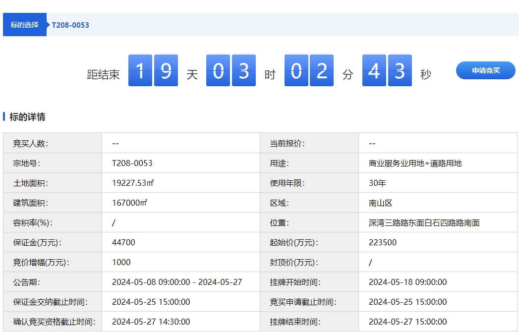 2024年5月8日,深圳公共资源交易中心上线了一则新的土地转让信息,以挂牌方式公开转让T208-0053宗地使用权,转让起始价约为22.35亿元。