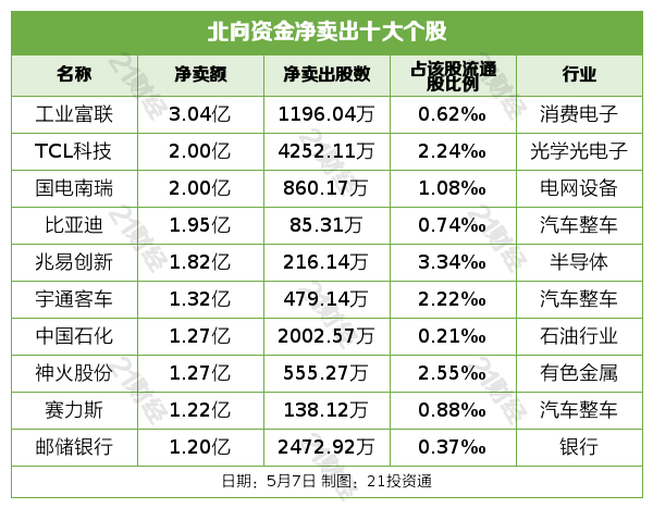 北向资金净卖出工业富联(601138.SH)、TCL科技(000100.SZ)、国电南瑞(600406.SH)、比亚迪(002594.SZ)、兆易创新(603986.SH)居前,其中,工业富联被净卖出3.04亿元,TCL科技被净卖出2.00亿元,国电南瑞被净卖出2.00亿元,比亚迪被净卖出1.95亿元,兆易创新被净卖出1.82亿元。