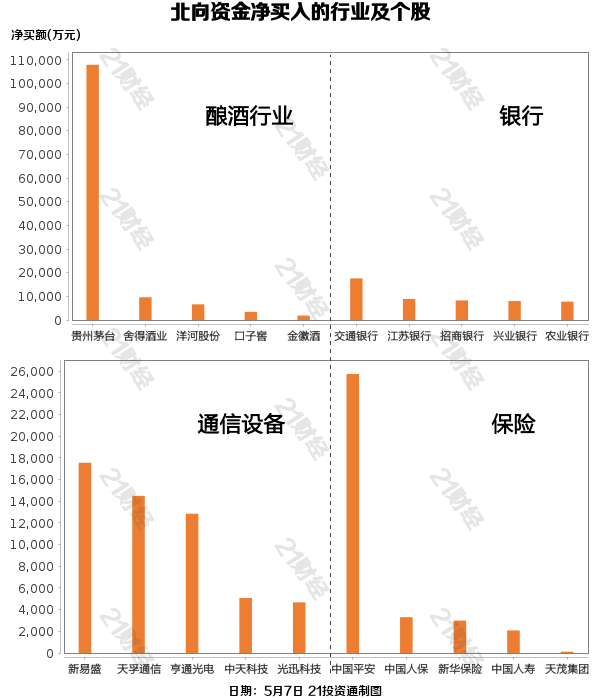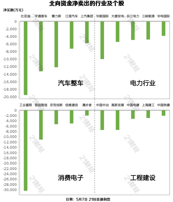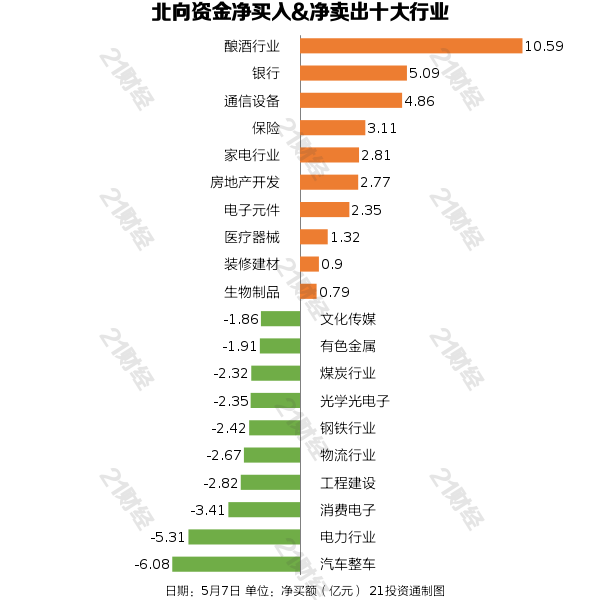 据21投资通智能监测,5月7日,北向资金净卖出21.4亿元,其中沪股通净卖出3.51亿元,深股通净卖出17.89亿元。