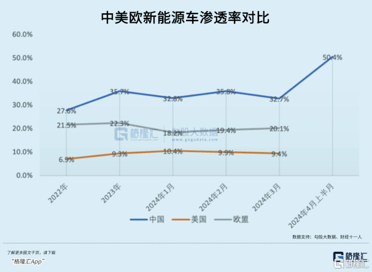 如今,以上两方面均发生了一些积极变化。从今年4月开始,中国新能源车渗透率突然大幅飙升至50%以上,远超出市场预期,而此前月份仅仅30%多。其次,中国新能源车竞争力非常强,海外市场高歌猛进——今年一季度出口30.7万台,同比大增23.8%。这还是在美国和欧盟渗透率基本不变或略有下滑的态势下实现的。
