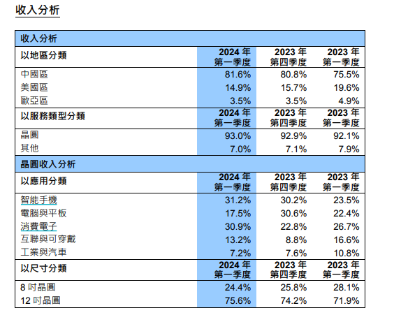 中芯国际第一季度按应用分类,收入占比分别为:智能手机31.2%、计算机与平板17.5%、消费电子30.9%、互联与可穿戴13.2%、工业与汽车7.2%。