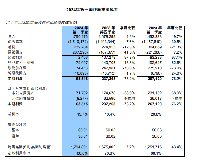 中芯国际管理层表示,2024年一季度全球客户备货意愿有所上升,公司销售收入为17.5亿美元,环比增长4.3%;毛利率为13.7%,均好于指引。出货179万片8英寸当量晶圆,环比增长7%;产能利用率为80.8%,环比提升四个百分点。