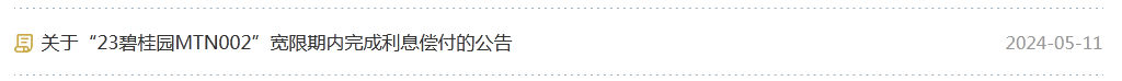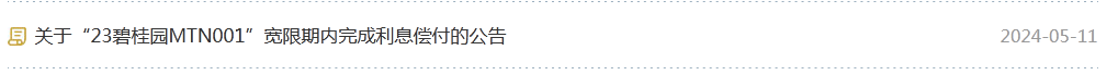 5月11日下午,碧桂园地产在中国银行间市场交易商协会发布公告,宣布中期票据“23碧桂园MTN001”“23碧桂园MTN002”均在宽限期内完成利息偿付。