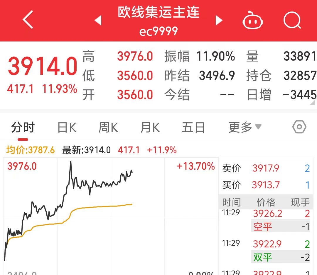 5月13日,欧线集运主连高开高走,盘中一度涨超13%,截至早盘收盘涨11.93%,突破3900点。4月以来,欧线集运主连累计涨超110%。