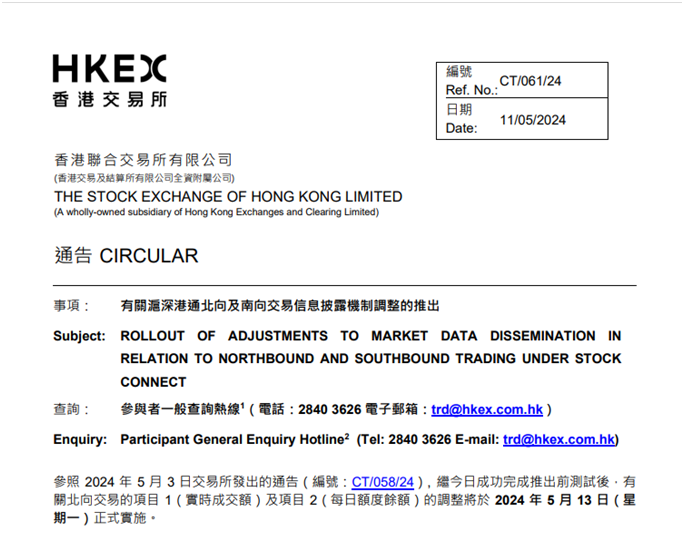 5月11日,港交所公告,参照此前交易所发出的通告,继成功完成推出前测试后,有关北向交易的实时成交额及每日额度余额的调整将于5月13日(星期一)正式实施。