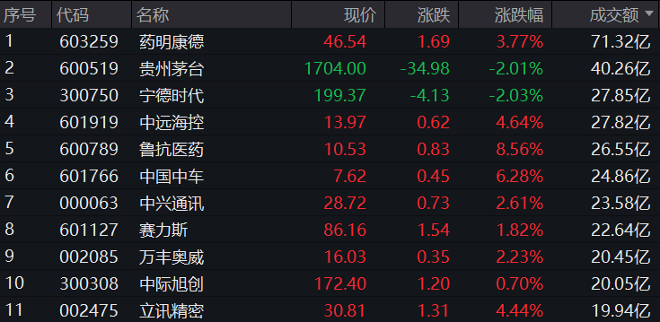 沪深两市半日成交额5694亿,较上个交易日同期缩量112亿。个股方面,药明康德半日成交额71.32亿元居首,贵州茅台成交额超40亿元,宁德时代、中远海控、鲁抗医药成交额均超25亿元。