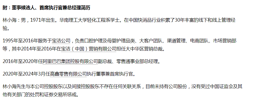 据了解,林小海毕业于华南理工大学,1995年至2016年服务于宝洁公司,负责口腔护理及母婴护理品类、大客户团队、渠道管理、电商团队、市场营销部等,其中2014年至2016年在宝洁(中国)营销有限公司担任大中华区营销总裁;2016年至2020年任阿里巴巴集团控股有限公司副总裁、零售通事业部总经理;2020年至2024年3月任高鑫零售有限公司执行董事兼首席执行官。