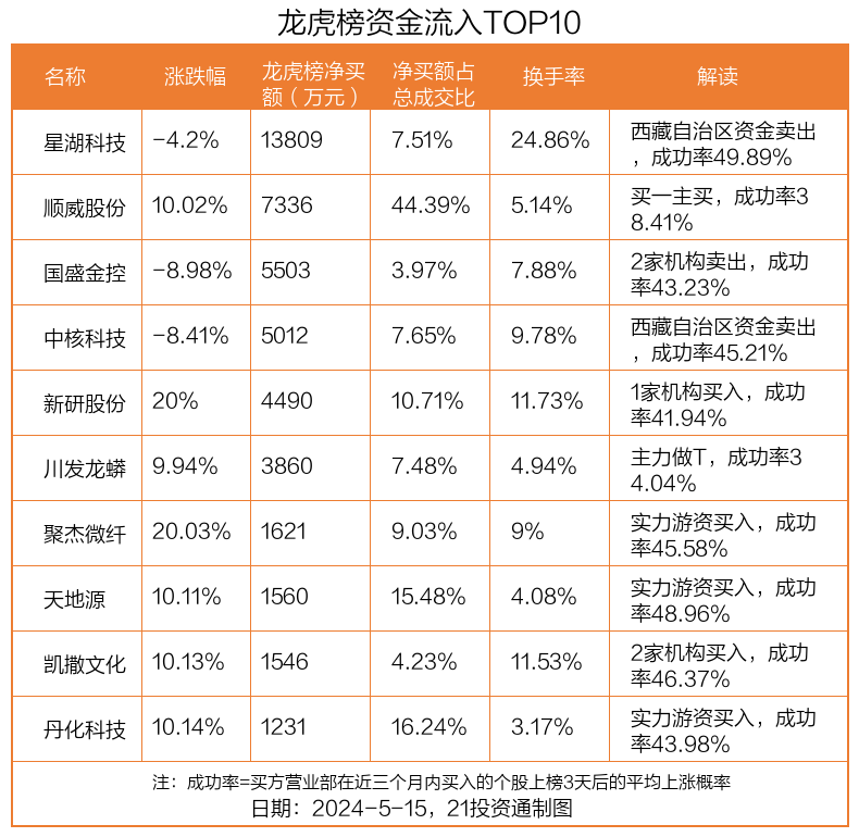 5月15日,上证指数下跌0.82%,深证成指下跌0.88%,创业板指下跌0.9%。盘后龙虎榜数据显示,共有48只个股因当日异动登上龙虎榜,资金净流入最多的是星湖科技(600866.SH),达1.38亿元。