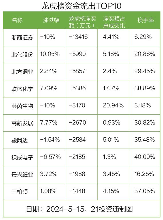 而龙虎榜中资金净流出最多的是浙商证券(601878.SH),被净卖出为1.34亿元,占总成交金额的4.41%。浙商证券收盘下跌10%,换手率为6.29%。