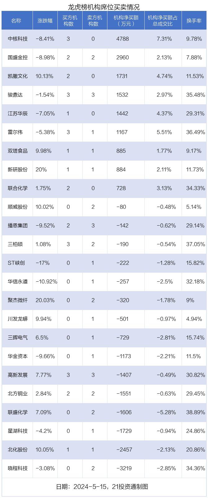 其中,机构净买入金额最多的是中核科技(000777.SZ),当日收盘下跌8.41%,换手率为9.78%。