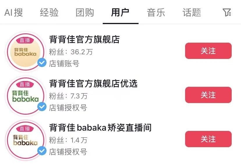 目前,背背佳在抖音有三个账号,分别是“背背佳官方旗舰店”、“背背佳官方旗舰店优选”、“背背佳babaka矫姿直播间”。平台信息显示,“背背佳官方旗舰店”为店铺账号,截至5月14日下午五点,粉丝数量为36.2万,后两个均为店铺授权号。5月14日下午两点半,三个店铺的总观看人数不到200人。