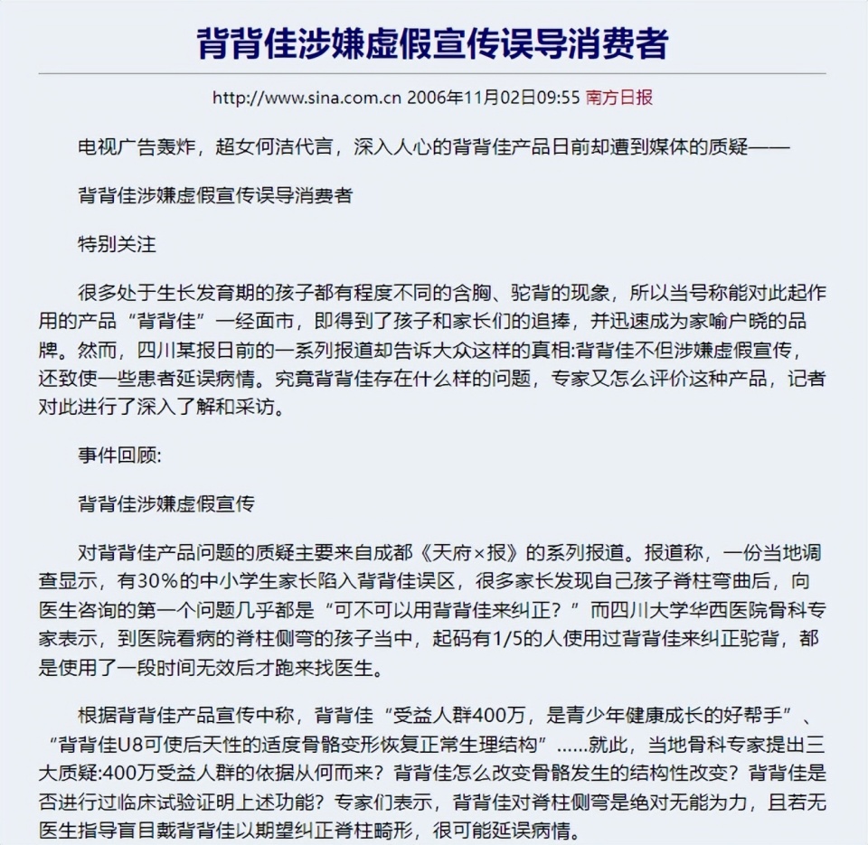 然而在家长和孩子中几乎人尽皆知的背背佳,近些年却逐步淡出了大众视线,背后是何原因呢?《南方日报》2006年发布了一篇名为《背背佳涉嫌虚假宣传误导消费者》的文章,文章中提到,背背佳宣称可使“后天性的适度骨骼变形恢复正常生理结构”的说法,遭到了骨科专家的质疑。事实上关于背背佳是否真的具备广告所说的功效,在部分消费者心中一直是个疑问。