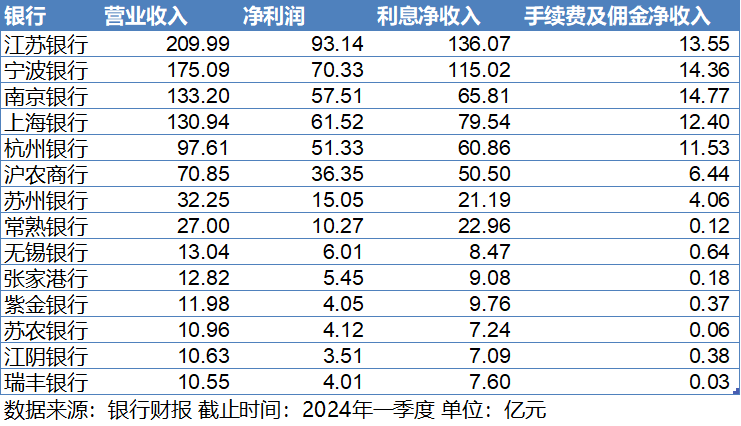 拆分来看,江苏银行、宁波银行的利息净收入依旧保持前二,但手续费和佣金净收入方面,最高的是南京银行,为14.77亿元,其次是宁波银行,为14.36亿元。