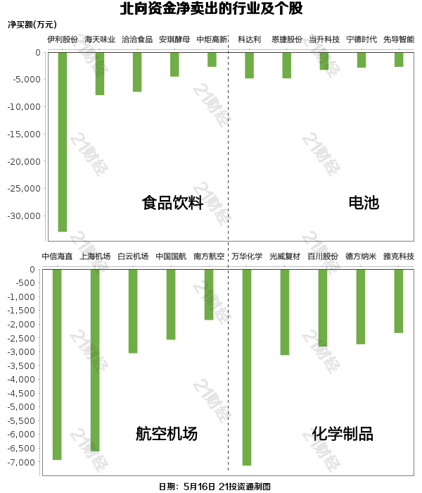 北向资金减持了29个行业,其中食品饮料最多,净卖出金额达4.50亿元,其次是电池行业,净卖出3.29亿元。