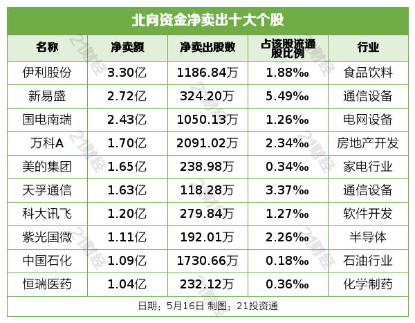 北向资金净卖出伊利股份(600887.SH)、新易盛(300502.SZ)、国电南瑞(600406.SH)、万科A(000002.SZ)、美的集团(000333.SZ)居前,其中,伊利股份被净卖出3.30亿元,新易盛被净卖出2.72亿元,国电南瑞被净卖出2.43亿元,万科A被净卖出1.70亿元,美的集团被净卖出1.65亿元。