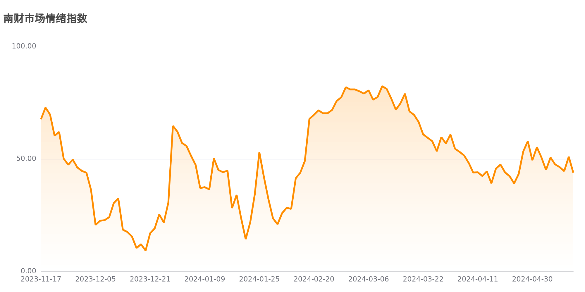 今日南财市场情绪指数为44.0,较前一交易日51.1大幅下跌,市场投资热度明显降低。
