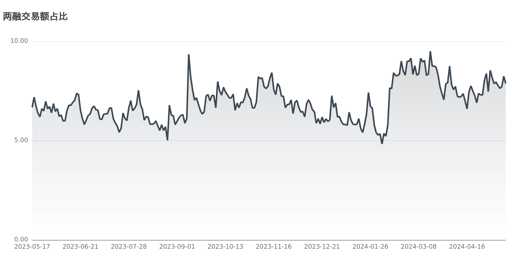 今日该指标值为7.87%,目前该指标处于近一年较高区间,认为当前A股市场相对较强。反映场内投资者借钱炒股的杠杆水平,该指标越高说明杠杆水平越高,即投资者认为当前市场较强,反之则说明投资者认为市场相对较弱,因而与上证指数存在较强的正相关性。
