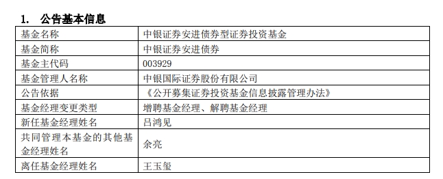 中银证券安进债券A(003929.OF)发布基金经理变更的公告,因工作调整王玉玺离任,吕鸿见接任,共同管理本基金的基金经理余亮留任。