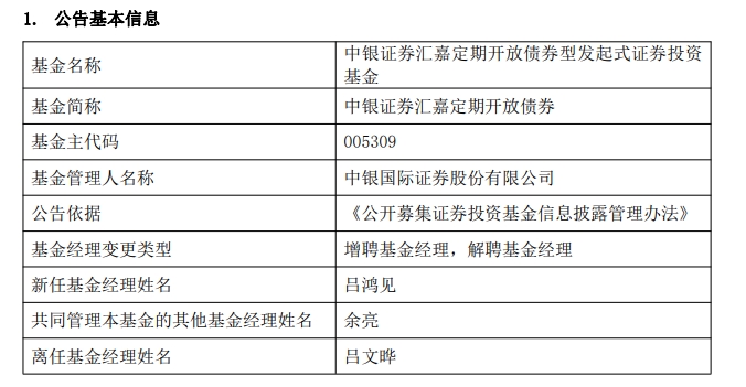 中银证券汇嘉定期开放债券(005309.OF)的基金经理也发了变更,因工作调整吕文晔离任,吕鸿见接任,共同管理本基金的基金经理余亮留任。