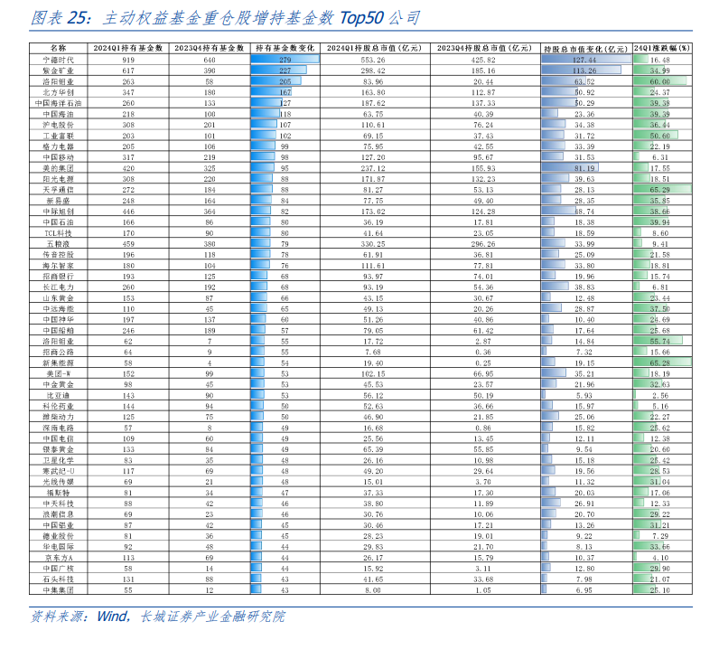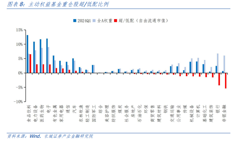 从上市板块占比来看,主板的占比显著提升,由23Q4的62.00%上升至24Q1的72.22%,上升幅度为10.22个百分点;创业板与科创板的占比有所下降,创业板占比由23Q4的21.05%下降至24Q1的17.79%,科创板占比由23Q4的14.90%下降至24Q1的9.87%。分行业来看,当前重仓股行业占比前三的行业是食品饮料、电子以及医药生物,24Q1的占比分别为13.15%、11.98%以及11.71%。从行业占比的季度变化来看,有色金属获得较大幅度的加仓,行业的占比较上季度提高了1.90个百分点。减配方面,预期兑现的生物医药和计算机遭遇较大幅度的减持,持仓占比较23Q4分别下降了2.89个百分点以及1.72个百分点。从超/低配比例来看,目前超配比例超过基准1%的为食品饮料、电力设备、医药生物、电子、有色金属、家用电器以及通信,超配比例分别为6.50%、3.01%、3.00%、2.96%、1.70%、1.55以及1.08%。非银金融及银行的持仓占比依然处于大幅低配的状态,低配比例分别为-5.39%以及-4.30%。以产业链上中下游进行区分,主动权益基金在四季度对上游及中游进行了更多的布局,上游行业占比由23Q4的6.84%提升至24Q1的8.62%,中游行业占比由23Q4的25.57%提升至28.13%。下游行业相对于23Q4的减配比例约为4.83个百分点,主要原因是由于资源品价格加速上涨以及消费不及预期的双重挤压。从更长的周期来看,上游行业达到了18Q1以来的配置最高比例,下游行业时隔9个季度配置比例重回60%以上后再度跌破。