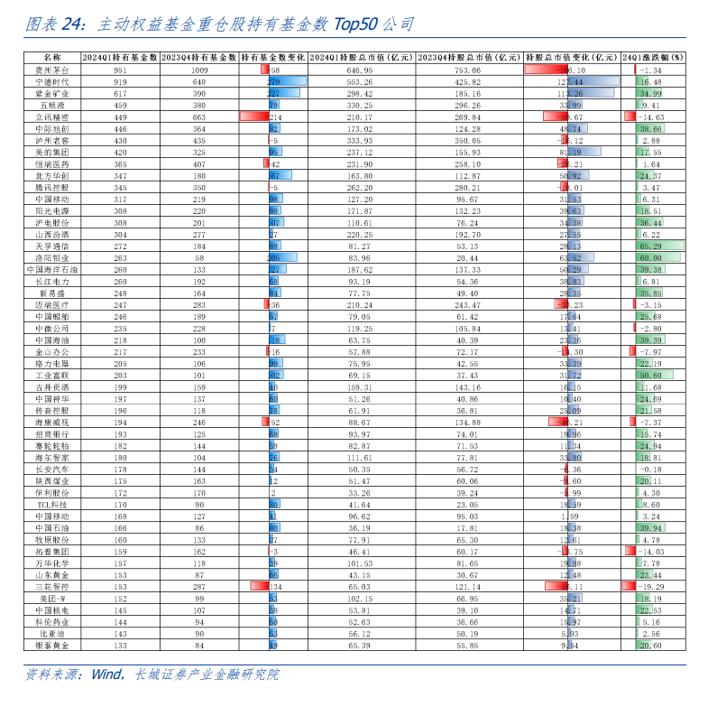 分行业来看,当前重仓股行业占比前三的行业是食品饮料、电子以及医药生物,24Q1的占比分别为13.15%、11.98%以及11.71%。