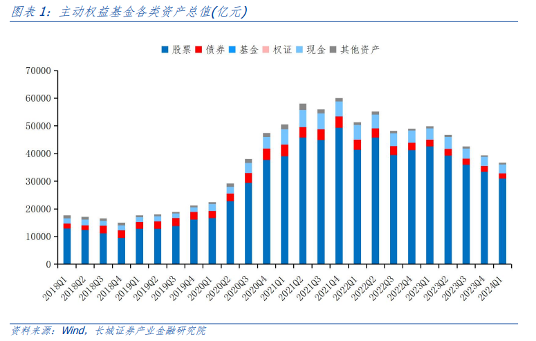 24Q1主动权益基金的资产总值延续了23Q4小幅下滑的态势,股票资产从23Q4的3.34万亿元小幅下滑至3.10万亿元,债券资产从2054亿元下滑至1873亿元。