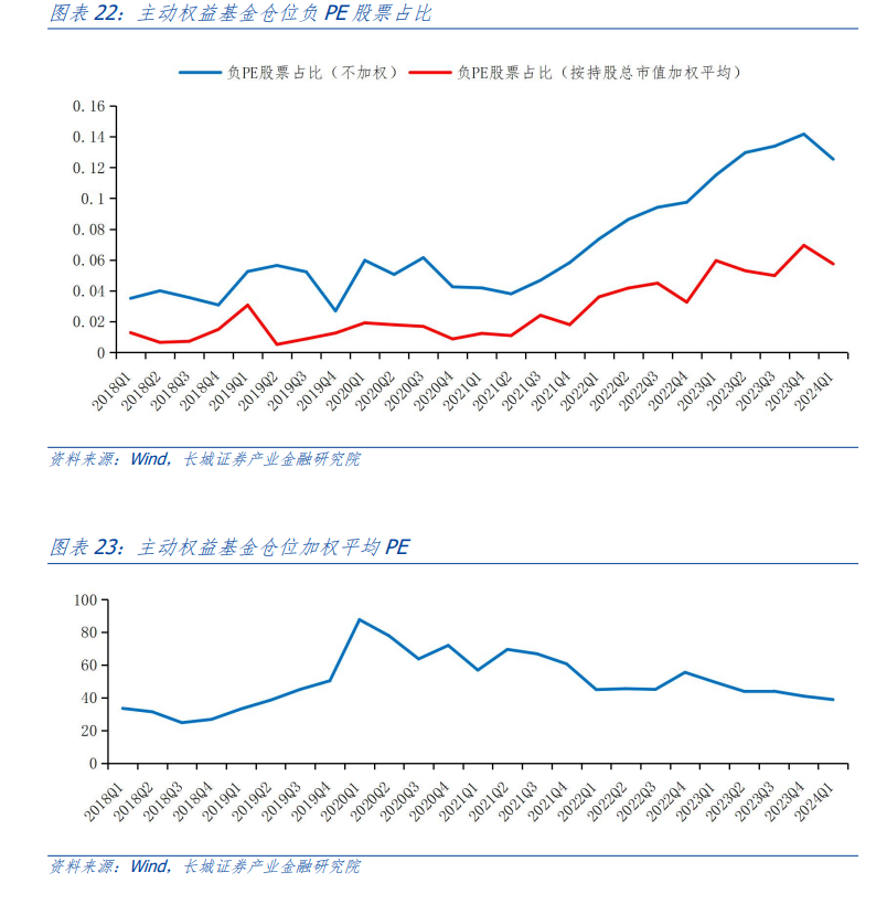 从PE来看,若使用简单平均,主动权益基金仓位负PE股票占比自连续十个季度上升后首次小幅下降,自23Q4的14.16%下降至24Q1的12.54%,回到了约23Q2的水平。