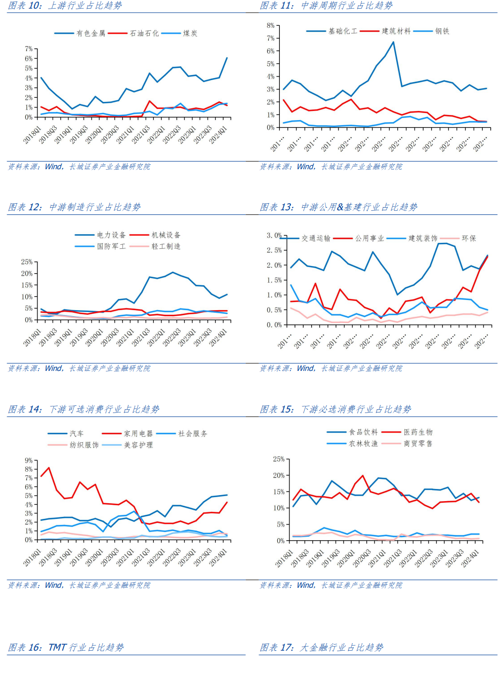 细分来看,上游行业中有色金属的配置比例在一季度大幅上升约2个百分点,煤炭的配置比例小幅上升,石油化工的配置比例小幅下降。中长期来看,上游行业整体配置比例依然处在19Q1以来的上升周期。