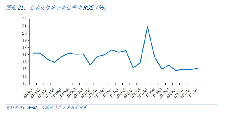 从平均ROE来看,主动权益基金仓位略有上升,从23Q4的15.09%上升约0.6个百分点至24Q1的15.69%,整体仍保持相对稳定。