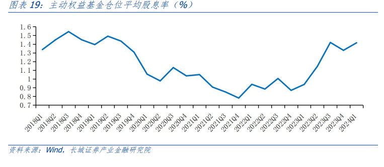 主动权益基金仓位平均股息率有所上升,从23Q4的1.33%上升0.09个百分点至1.42%,但仍保持在20Q1以来的相对高位。