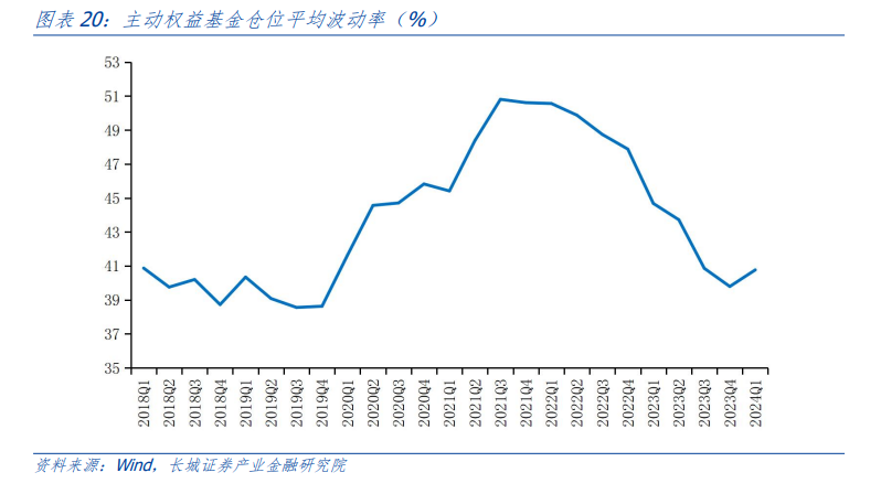 从平均波动率来看,主动权益基金仓位维持了22Q1以来的下降趋势, 24Q1平均波动率约为40.77%,相较23Q4的39.79%,小幅反弹约0.98个百分点。目前,平均波动率仍处于20Q1以来的历史低位,仅略高于23Q4的39.79%。