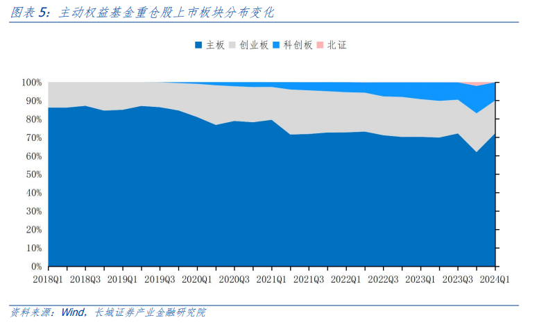 从上市板块占比来看,主板的占比显著提升,由23Q4的62.00%上升至24Q1的72.22%,上升幅度为10.22个百分点;创业板与科创板的占比有所下降,创业板占比由23Q4的21.05%下降至24Q1的17.79%,科创板占比由23Q4的14.90%下降至24Q1的9.87%。