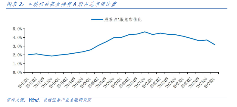 主动权益基金股票持仓占A股总市值比重略有下降的趋势。该比重从23Q4的3.70%下降至24Q1的3.18%,幅度为0.52个百分点。该比重自22Q2以来整体呈现下降趋势,但较21Q4的高点4.64%仍减少1.36个百分点。