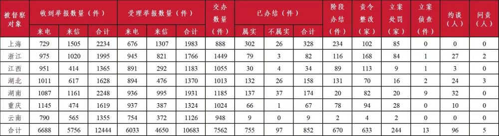 7个督察组于5月7日至9日陆续进驻上海、浙江、江西、湖北、湖南、重庆、云南七省(市),统筹开展流域督察和省域督察。截至5月20日晚,7个督察组共收到群众来电、来信举报12444件,受理有效举报10683件,经梳理合并重复举报,累计向被督察地方转办7562件;被督察地方已办结或阶段办结1522件,其中立案处罚244家,立案侦查13件;约谈党政领导干部96人,问责党政领导干部5人。