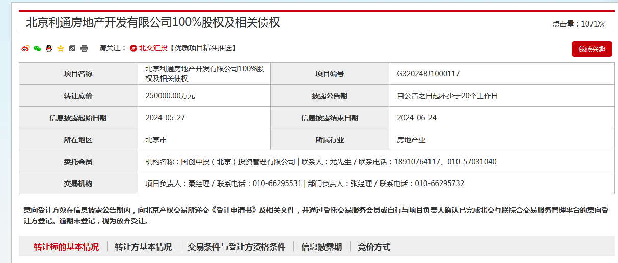 5月27日,北京产权交易所显示,北京利通房地产100%股权及相关债权被挂牌转让。