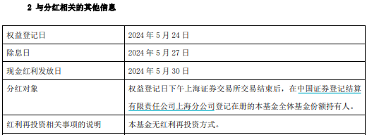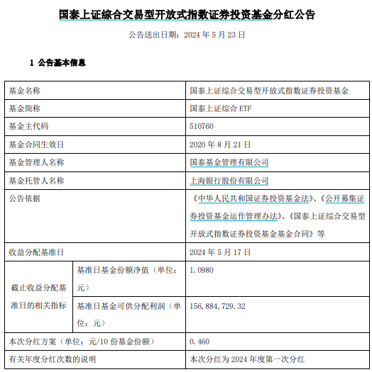 5月23日,上证综指ETF(510760)发布分红公告。根据本次收益分配方案,每10份分红0.46元。权益登记日为5月24日,除息日为5月27日,现金红利发放日为5月30日。分红比例为4.19%。