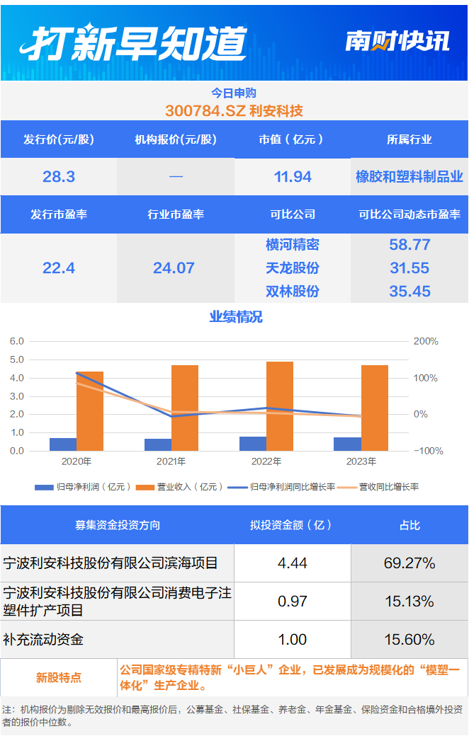 5月28日,可申购创业板上市的利安科技,该公司成立于2006年,主要从事注塑产品以及精密注塑模具的研发、生产和销售,是集产品工业设计、精密模具设计、制造、注塑、喷涂以及组装等于一体的专业精密制造企业。