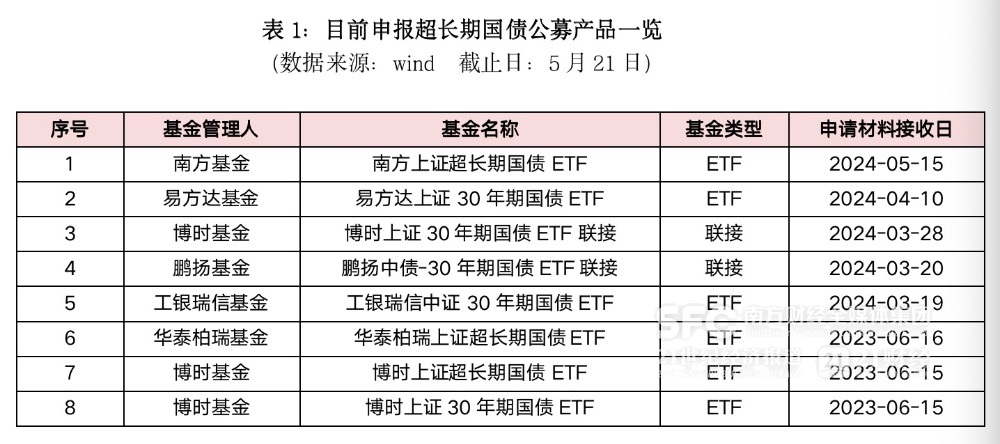 证监会官网显示,3月中下旬以来,陆续有博时、华泰柏瑞、南方等基金公司申报了“上证超长期国债ETF”;易方达、工银瑞信、博时等基金公司申报了“上证30年期国债ETF”;博时、鹏扬等基金公司申报了“30年国债ETF联接基金”。